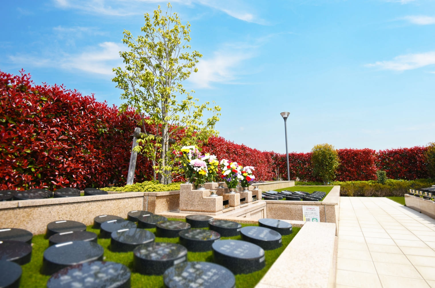 自然を感じる、広々とした樹木葬専用の区画で、一般墓と同様にお線香やお花のお供えが可能です。まどかの杜の樹木葬は、心ゆくまでゆっくりとお参りができます。